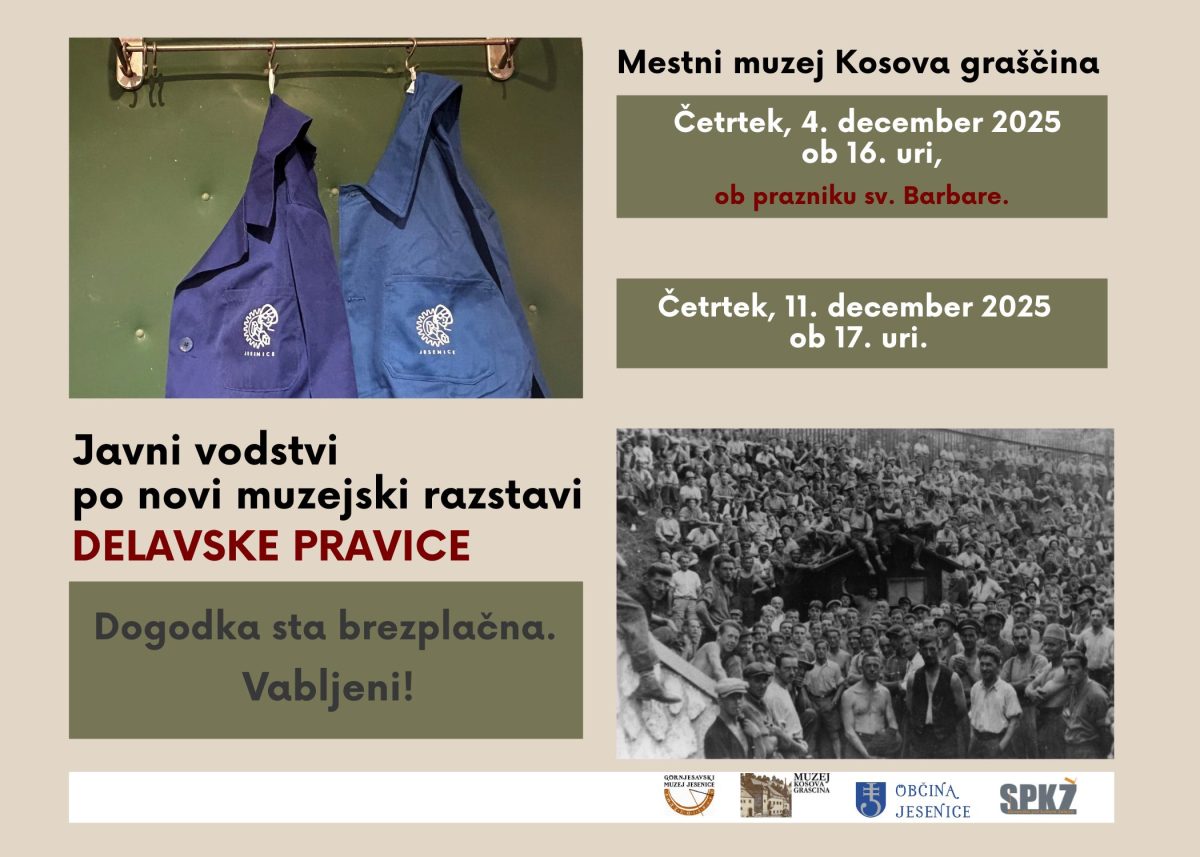 Vabljeni v Mestni muzej Kosova graščina na dve javni vodstvi po aktualni muzejski razstavi Delavske pravice. Prvo javno vodstvo pripravljamo ob Prazniku sv. Barbare, 4. decembra 2025, ob 16. uri, drugo pa kot del spremljevalnega programa, prav tako v četrtek, 11. decembra 2025, ob 17. uri. Vstopnine ni.