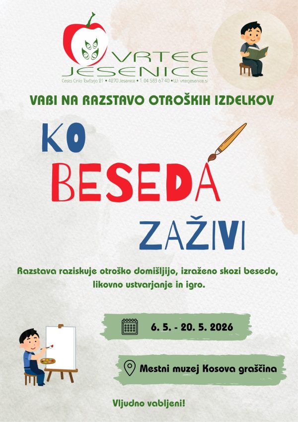 Vrtec Jesenice je v šolskem letu 2025/2026 zaključil izvajanje te prednostne naloge in se v želji po predstavitvi širši javnosti povezal z Gornjesavskim muzejem Jesenice. V avli Mestnega muzeja Kosova graščina Jesenice bo tako od 6. do 20. maja 2026 na ogled občasna razstava otroških izdelkov iz vseh enot Vrtca Jesenice, ki so nastali v procesu dela. Vabljeni, da si jo ogledate v času odprtosti muzeja ali po predhodnem dogovoru.